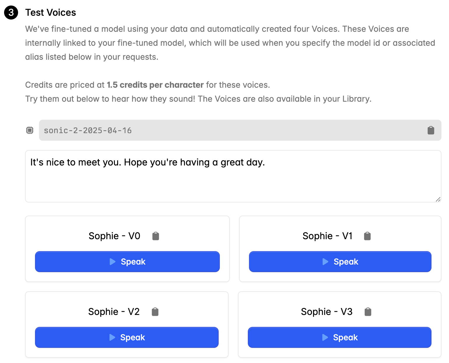 Once training is complete, we’ll automatically create 4 Voices based on different source audio clips from your dataset. These Voices are internally linked to your fine-tuned model, which will be used when you specify the model id or alias listed below in your requests.