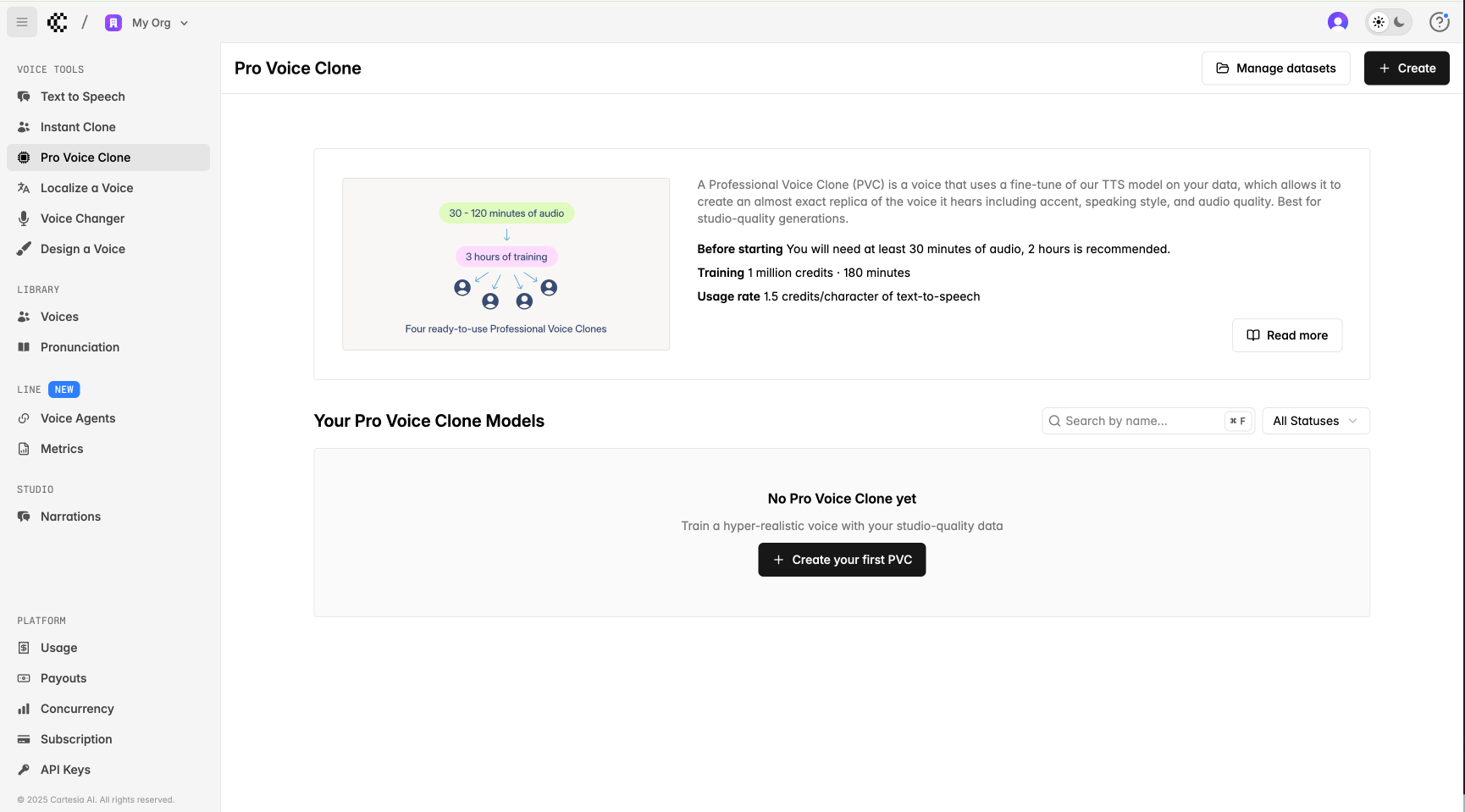 Pro Voice Cloning is available in the Playground for anyone with a Cartesia subscription of Startup or higher. It allows you to create highly accurate voice clones by leveraging a larger amount of data compared to instant cloning.| Feature | Required audio data | Pricing: cost to create | Pricing: cost to use for TTS |