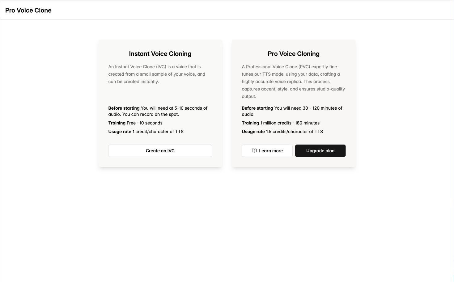 | Pro Voice Clone | 3 hours | 1M credits on success | 1.5 credits per character |