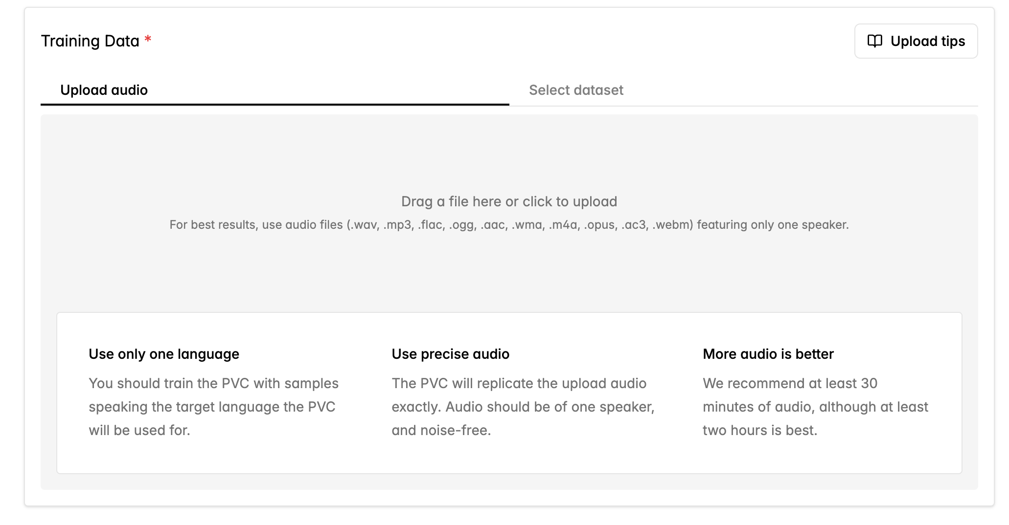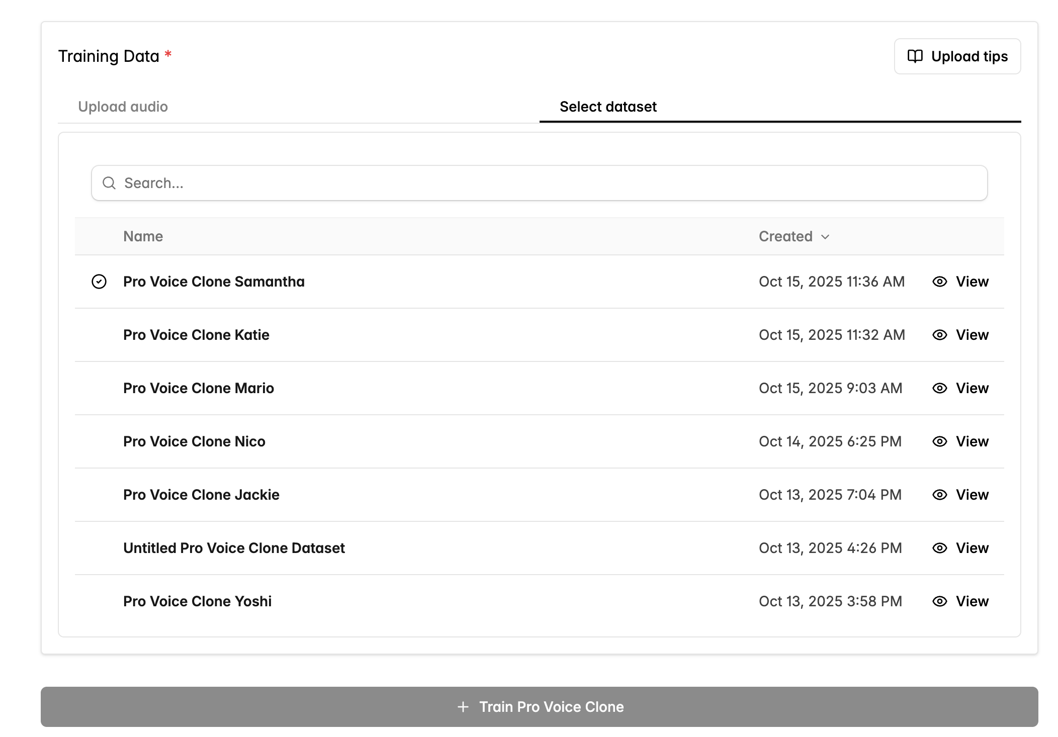 If you also reused data from past Pro Voice Clones. Switch to the Select dataset tab to view previous datasets. These datasets can be edited separately from your PVCs and are helpful for managing your audio files.
