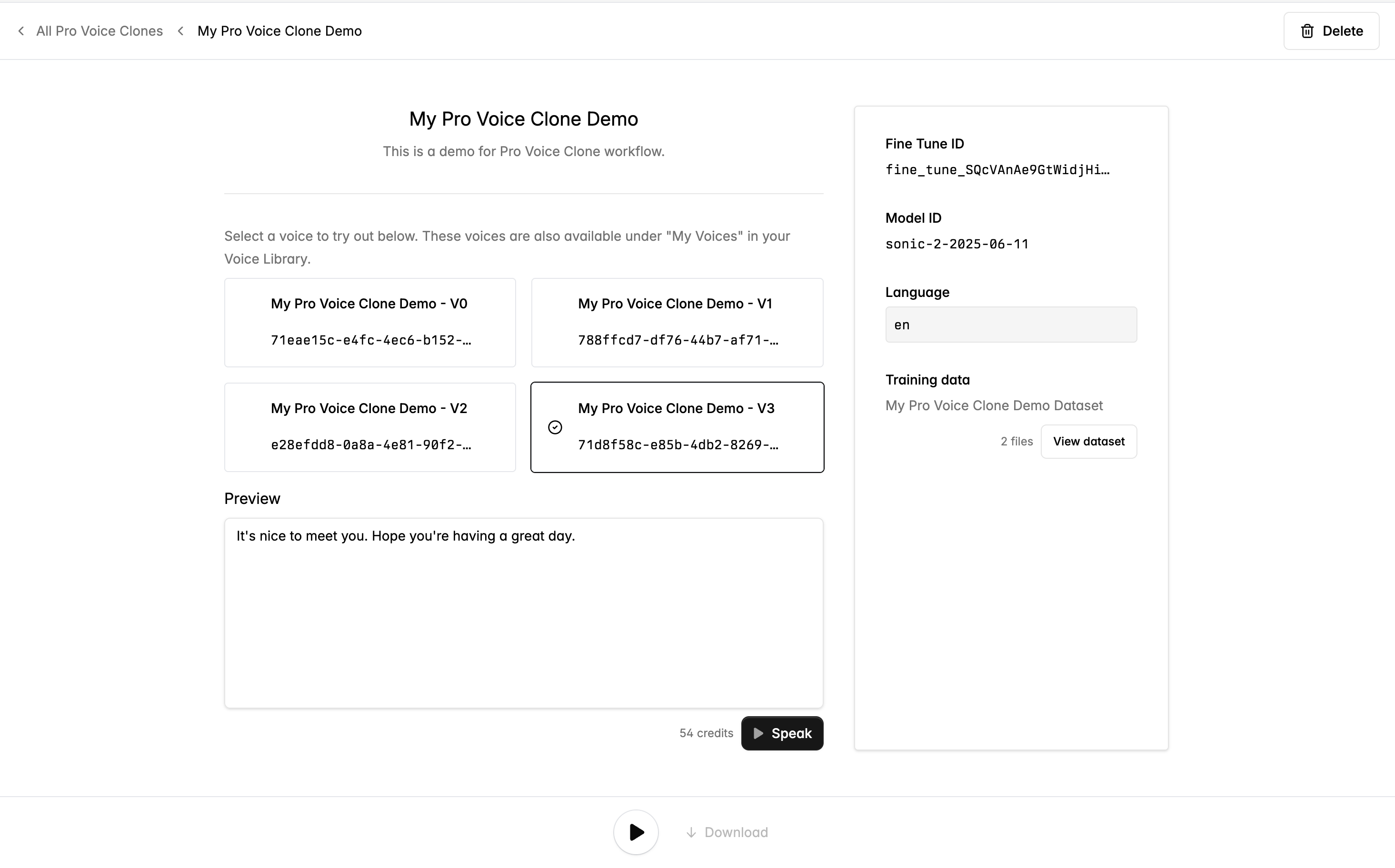 Once training is complete, we’ll automatically create four Voices based on different source audio clips from your dataset. These Voices are internally linked to your fine-tuned model, which will be used when you specify the model ID of the fine-tuned model in your requests.The Voices are also available in the Voice Library under My Voices and can be used through the API.