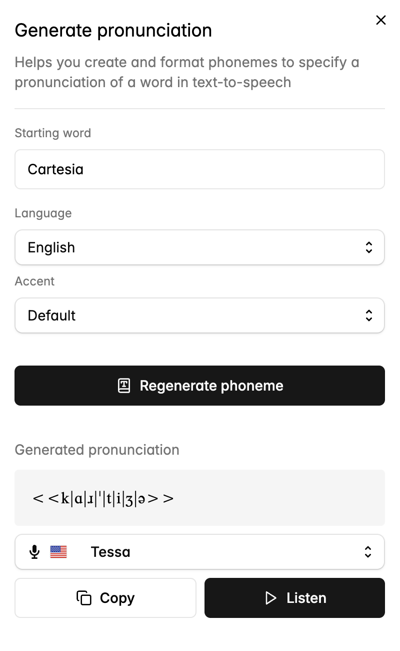 For example, Cartesia is written <<k|ɑ|ɹ|ˈ|t|i|ʒ|ə>>.For users familiar with IPA who wish to input IPA directly, sonic-3 supports the following phonemes:| Phoneme | Example (American accent) |